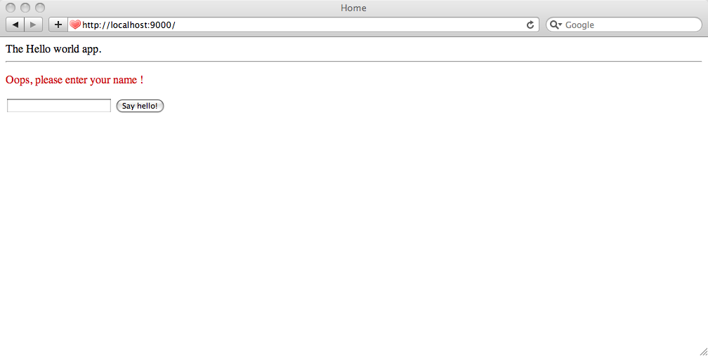 Now you just have to display the error message if any. Edit the helloworld/app/views/Application/index.html: