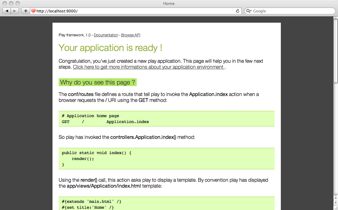 You can see the new application by opening a browser to http://localhost:9000. A new application has a standard welcome page that just tells you that it was successfully created.