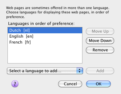 Once you have saved these changes, you can see the different language versions in your web browser by changing the setting that results in a different Accept-Language HTTP request header. In Firefox, select Preferences » Content » Languages » Choose…, add French [fr] and Dutch [nl] if they are not already in the list, change which one is at the top of the list, close the dialogue box and reload the page.