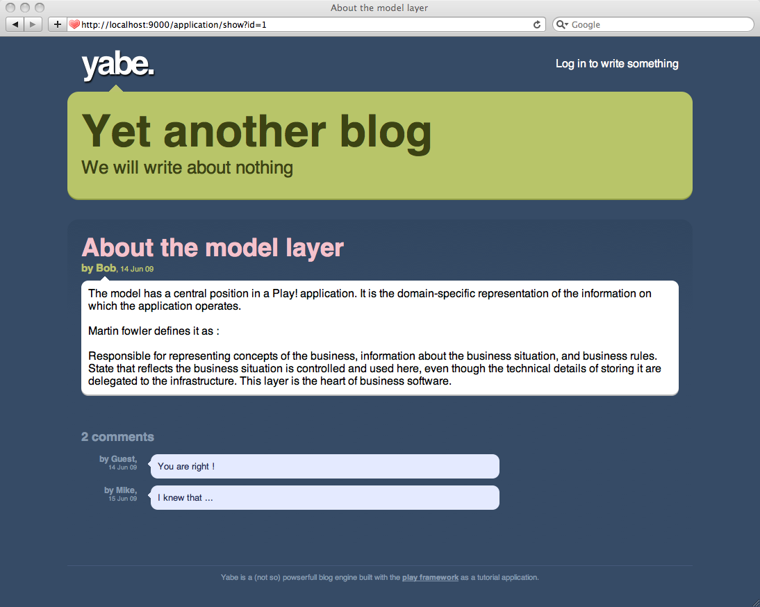 It’s great, but it lacks a link to go back to the home page. Edit the /yabe/app/views/main.html template to complete the title link: