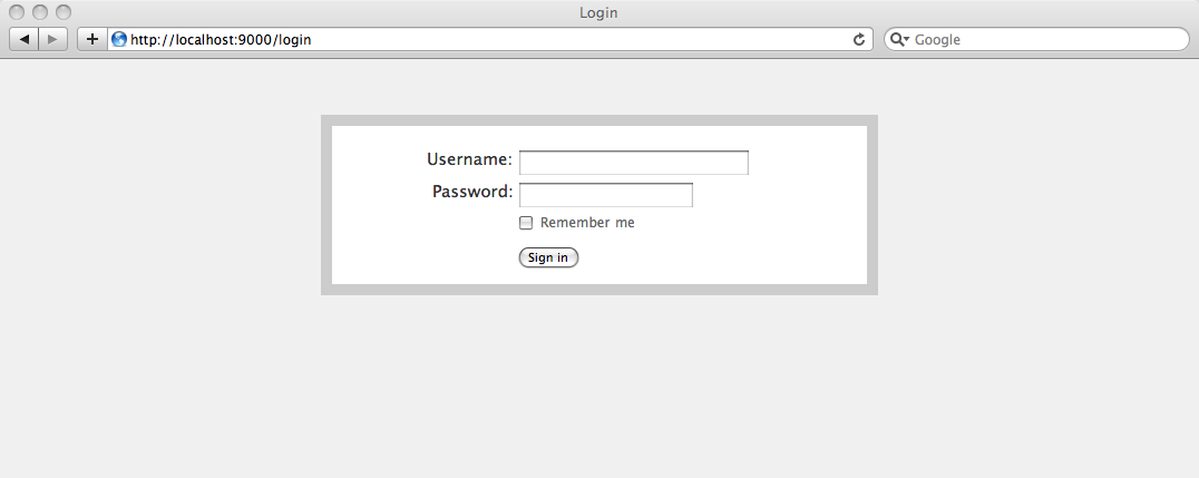 Now go to http://localhost:9000/logout to log out and you can try logging in with one of the users imported in the initial-data.yml file, like bob@gmail.com/secret.