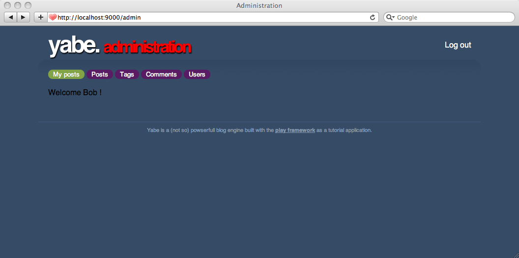 The last thing to make all this new stuff work is to create the yabe/app/views/Admin/index.html template. Let’s start with something simple: