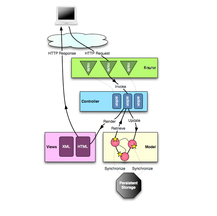 A Controller is a Java class where each public, static, method is an action. An action is a Java entry point invoked when an HTTP Request is received. The Java code from the Controller class isn’t really object oriented: it’s mainly procedural code. The action method extracts relevant data from the HTTP Request, reads or updates the model objects, and sends back a result which is wrapped into an HTTP Response.