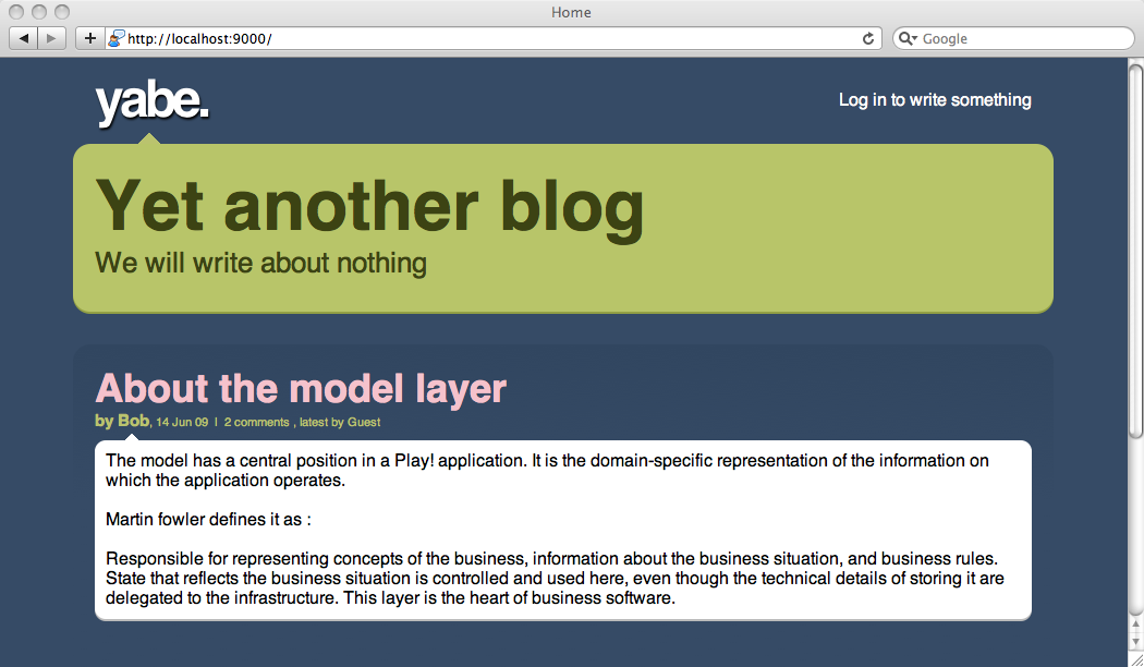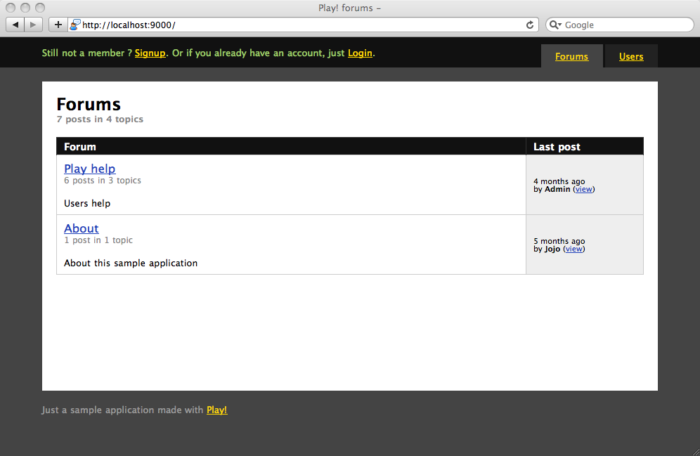 Play comes with the following set of sample applications in the samples-and-test/ directory, in the framework installation path. We use them to run our automated test suite, and you can take a look at them to discover typical Play usages.