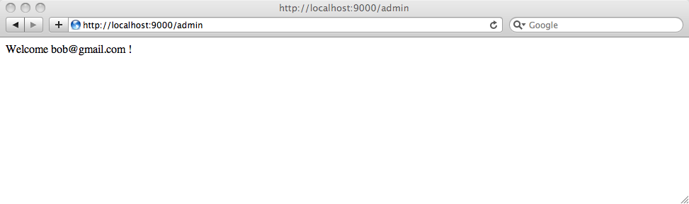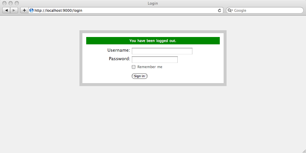 Now go to http://localhost:9000/logout to log out and you can try logging in with one of the users imported in the initial-data.yml file, like bob@gmail.com/secret.