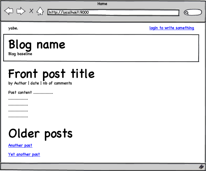 最初の画面がどのようにして表示されるのか覚えていますか? まず最初に、routes ファイルで / という URL が controllers.Application.index() というアクションメソッドを起動するよう指定します。次に、このメソッドが render() を呼び出して /yabe/app/views/Application/index.html テンプレートを実行します。