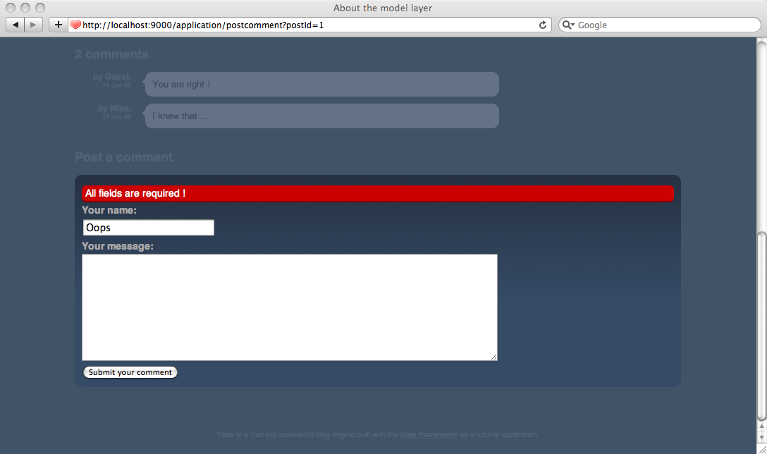 投稿者により親切な UI フィードバックを提供するために、エラーが発生した場合には、自動的にコメントフォームにフォーカスをセットする、ちょっとした JavaScript を追加します。このスクリプトは JQuery と JQuery Tools Expose を補助ライブラリとして使用するので、これらを include する必要があります。これら 2 つのライブラリを /yabe/public/javascripts にダウンロードしたら、これらを include するよう main.html を変更してください: