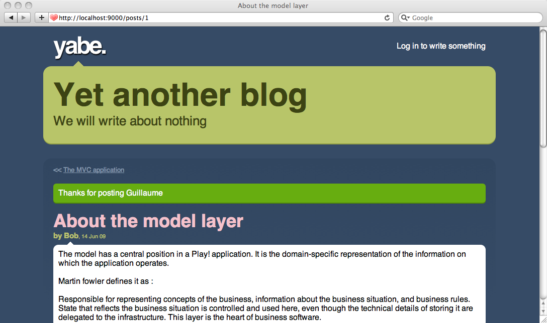 よく出来ていますが、トップページへ戻るためのリンクがありません。 /yabe/app/views/main.html テンプレートを編集して、タイトルへのリンクを完成させます: