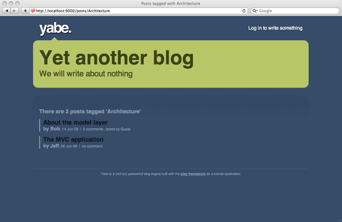 テスト用の投稿にいくつかのタグを追加するよう /yabe/conf/initial-data.yml を変更してください。例えば、以下のようにします: