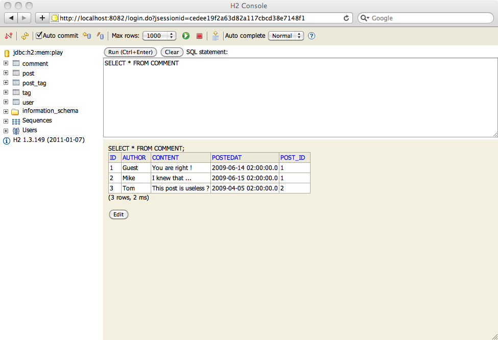 良い副作用として、H2 は db=mem が設定されているどのような Play アプリケーション でも /@db という URL で起動できる Web コンソールを提供します。
