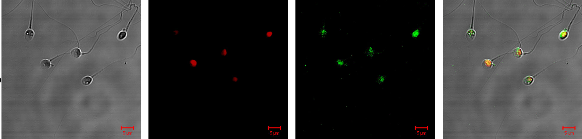Immunocytochemistry of washed motile ejaculated human spermatozoa incubated with antibodies against epididymal secretory proteins and testicular proteins (right panels, merged micrographs of fluorescence staining). Red staining (by PI) indicates the nuclei and green staining (by FITC) indicates the location of HEL-S-67p on spermatozoa. Each bar represents 5 um.