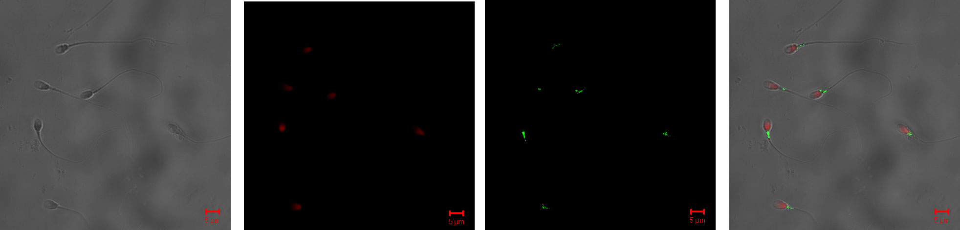 Immunocytochemistry of washed motile ejaculated human spermatozoa incubated with antibodies against epididymal secretory proteins and testicular proteins (right panels, merged micrographs of fluorescence staining). Red staining (by PI) indicates the nuclei and green staining (by FITC) indicates the location of HTL-T-74n on spermatozoa. Each bar represents 5 um.